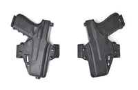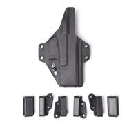 The body-hugging curvature of this OWB holster is accomplished using modular belt loops. Each OWB holster includes three pair of 1.5” belt loops (LH 10 degree cant, RH 10 degree cant, and ambi 0 degree cant), which allow the end-user to configure the ambidextrous holster body for left-handed or right-handed use, with either a 0-degree or 10-degree cant.